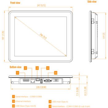 Kommunikáció: COM1: RS232/RS485/RS422; COM2/COM4: RS485; COM3: RS232